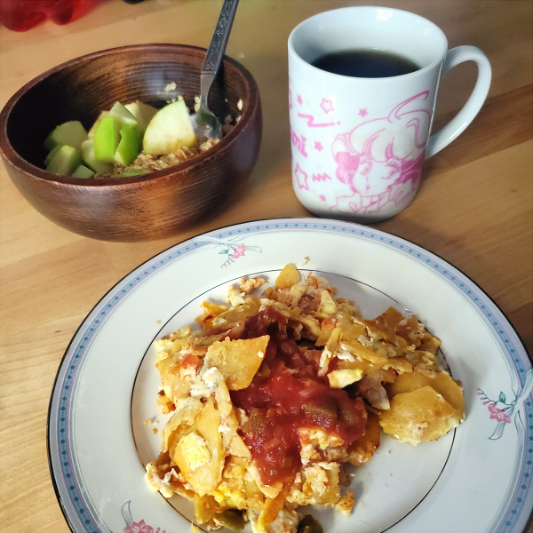 breakfast, plus my workspace!! i rarely ever make a whole spread like this, but i wanted to fuel up before working on my friend's commission. i've been making migas a lot lately since my grandpa loves it especially. paired with apple cinnamon oatmeal and some hot barley tea. delicious! and my workspace... what a mess! it would be nice to have space for an actual work desk for art, but country girls make do.